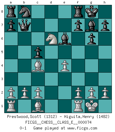Last move : 0-1 2008 May 15 22:0:29 [Event "FICGS__CHESS__CLASS_E__000074"] [Site "FICGS"] [Date "2008.01.30"] [Round "1"] [White "Prestwood,Scott"] [Black "Higuita,Henry"] [Result "0-1"] [WhiteElo "1312"] [BlackElo "1482"] 1.e4 e5 2.Nf3 d6 3.d4 exd4 4.Nxd4 g6 5.Bc4 Bg7 6.Nc3 Ne7 7.O-O O-O 8.Nd5 c5 9.Nb5 Nxd5 10.Qxd5 Qb6 11.Nxd6 Be6 12.Qxb7 Qxb7 0-1 This chess game has been lost on time (started : 2008.01.30 1:57:18) Philidor : Larsen variation Kingside Castling by player White (move 7) Kingside Castling by player Black (move 7) Player Black won this chess game. Follow this game move after move (download)Whoever sees no other aim in the game than that of giving checkmate to one's opponent will never become a good Chess player. (Euwe) Ein Springer auf f6 gegen die eigene Rochadestellung ist schlimmer als ein rostiger Nagel im Knie. (Efim Bogoljubov) El Ajedrez es una guerra en un tablero. El objetivo es aplastar la mente del oponente. (Bobby Fischer) Il s'avisa de me proposer d'apprendre les échecs qu'il jouait un peu... me voilà forcené des échecs. J'achète un échiquier, je m'enferme dans ma chambre, j'y passe des jours et des nuits à vouloir apprendre par cœur toutes les parties. (Jean-Jacques Rousseau, Confessions) Empty your mind, be formless, shapeless — like water. (Bruce Lee)
