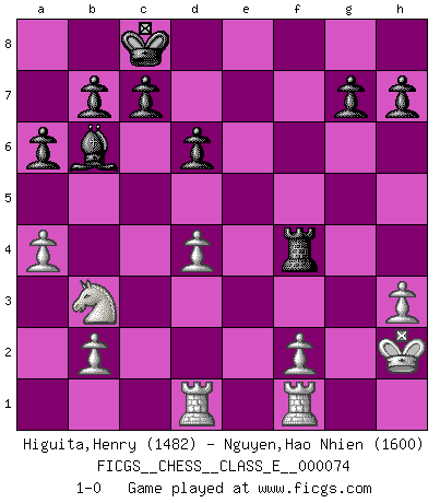 Last move : 1-0 2008 March 26 8:29:46 [Event "FICGS__CHESS__CLASS_E__000074"] [Site "FICGS"] [Date "2008.01.30"] [Round "1"] [White "Higuita,Henry"] [Black "Nguyen,Hao Nhien"] [Result "1-0"] [WhiteElo "1482"] [BlackElo "1600"] 1.e4 e5 2.Nf3 Nc6 3.Bc4 Nd4 4.d3 Nxf3+ 5.Qxf3 Qf6 6.Nd2 Bc5 7.a3 d6 8.h3 Be6 9.Qxf6 Nxf6 10.Bb3 O-O-O 11.O-O Nh5 12.Kh2 Bxb3 13.Nxb3 Bb6 14.c3 Rhf8 15.d4 exd4 16.cxd4 f5 17.exf5 Rxf5 18.Be3 Rdf8 19.a4 a6 20.g4 Nf4 21.gxf5 Rxf5 22.Bxf4 Rxf4 23.Rad1 1-0 King's pawn game Queenside Castling by player Black (move 10) Kingside Castling by player White (move 11) Player White won this chess game. Follow this game move after move (download)Place the contents of the Chess box in a hat, shake them up vigorously, pour them on the board from a height of two feet, and you get the style of Steinitz. (H. E. Bird) Ein Buch ist ein Spiegel; wenn ein Affe hineinsieht, so kann kein Apostel heraus gucken. (Georg Christoph Lichtenberg) Un jugador que es sorprendido, esta derrotado a medias. (Proverbio) Karpov est une pièce de musée. (Garry Kasparov) How many people work in NATO Headquarters ? - About half of them. (Dirk Stikker, NATO general secretary)