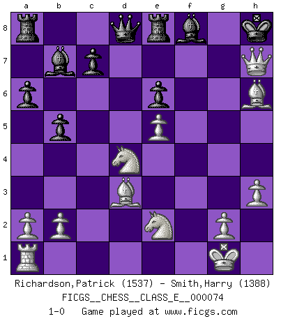 Last move : 1-0 2008 April 6 17:8:15 [Event "FICGS__CHESS__CLASS_E__000074"] [Site "FICGS"] [Date "2008.01.30"] [Round "1"] [White "Richardson,Patrick"] [Black "Smith,Harry"] [Result "1-0"] [WhiteElo "1537"] [BlackElo "1388"] 1.d4 d5 2.c4 e6 3.Nc3 dxc4 4.e4 Be7 5.Bxc4 Nf6 6.Nf3 O-O 7.O-O Nc6 8.Be3 Bb4 9.e5 Ng4 10.Bc1 a6 11.h3 b5 12.Bd3 Nxf2 13.Rxf2 Nxd4 14.Nxd4 Bb7 15.Qg4 Bc5 16.Bh6 g6 17.Nce2 Re8 18.Rxf7 Bf8 19.Rxh7 Kxh7 20.Qxg6+ Kh8 21.Qh7+ 1-0 QGD : 3.Nc3 Kingside Castling by player Black (move 6) Kingside Castling by player White (move 7) Player White won this chess game. Follow this game move after move (download)Via the squares on the chessboard, the Indians explain the movement of time and the age, the higher influences which control the world and the ties which link Chess with the human soul. (Al-Masudi) Es ist besser die Steine des Gegners zu opfern. (Savielly Grigorievitsch Tartakower) La vida es como el Ajedrez, con lucha, competición y eventos buenos y malos. (Benjamin Franklin) Le génie consiste à savoir transgresser les règles au moment opportun. (Teichmann) Always be a first-rate version of yourself, instead of a second-rate version of somebody else. (Judy Garland)