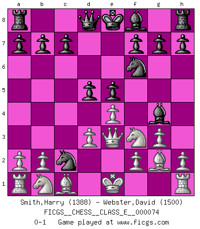 Last move : 0-1 2008 February 8 23:12:22 [Event "FICGS__CHESS__CLASS_E__000074"] [Site "FICGS"] [Date "2008.01.30"] [Round "1"] [White "Smith,Harry"] [Black "Webster,David"] [Result "0-1"] [WhiteElo "1388"] [BlackElo "1500"] 1.e4 Nf6 2.d3 Nc6 3.g3 e5 4.Nf3 d5 5.Qe2 Bg4 6.Bg2 Nd4 7.Qe3 Nxc2+ 0-1 Alekhine's defense : Maroczy variation Player Black won this chess game. Follow this game move after move (download)Do you realize Fischer almost never has any bad pieces? He exchanges them, and the bad pieces remain with his opponents. (Yuri Balashov) Ich erzeugte keinen Neid, da mich die Schachspieler als Musiker und die Musiker als Schachspieler betrachteten. (Mark Taimanov) Me gusta decir que Bobby Fischer fue el mejor jugador que jamás haya existido. Pero lo que hizo de Fischer un genio, fue su habilidad de mezclar una frescura y pragmatismo Americano con ideas Rusas acerca de la estrategia. (Bruce Pandolfini) Les Cavaliers se révèlent fort utiles dans les positions fermées. D'habitude, les Fous sont un peu plus forts que les Cavaliers dans les positions ouvertes. Qu'on le veuille ou non, il restera toujours des exceptions ! Luck is when opportunity knocks and you answer. (Anonymous)