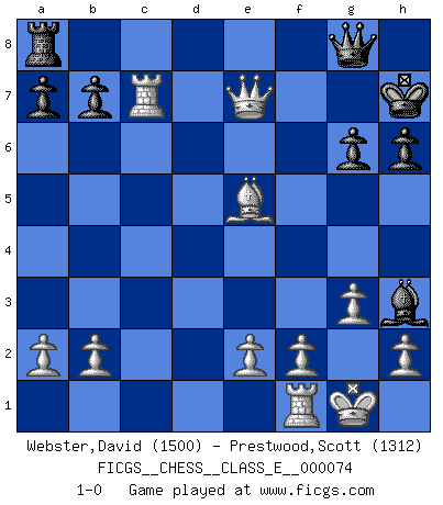 Last move : 1-0 2008 May 21 20:7:9 [Event "FICGS__CHESS__CLASS_E__000074"] [Site "FICGS"] [Date "2008.01.30"] [Round "1"] [White "Webster,David"] [Black "Prestwood,Scott"] [Result "1-0"] [WhiteElo "1500"] [BlackElo "1312"] 1.d4 Nf6 2.c4 g6 3.g3 c6 4.Bg2 d5 5.cxd5 cxd5 6.Nc3 Bg7 7.Nf3 O-O 8.O-O Nc6 9.Ne5 Qd6 10.Bf4 Rd8 11.Nxf7 Qd7 12.Nxd8 Qxd8 13.Qb3 Nxd4 14.Qd1 Ne6 15.Nxd5 Nxd5 16.Bxd5 Qd7 17.Rc1 Kh8 18.Bxe6 Qxe6 19.Qd8+ Qg8 20.Qxe7 Bf5 21.Be5 Bh3 22.Rc7 h6 23.Bxg7+ Kh7 24.Be5 1-0 King's Indian : 3.g3 Kingside Castling by player Black (move 7) Kingside Castling by player White (move 8) Player White won this chess game. Follow this game move after move (download)There are two types of sacrifices: correct ones and mine. (Mikhail Tal) Wenn ich gewinne bin ich ein Genie. Wenn nicht, dann bin ich keines. (Robert James Fischer) Por tratar de evitar la pérdida de una pieza, muchas personas han perdido una partida de Ajedrez. (Savielly Tartakover) On croit qu'il y a plus de mauvais joueurs que de bons joueurs, c'est faux : Il y a autant de joueurs qui gagnent que de joueurs qui perdent. (Philippe Geluck) If you lose the game you should win the analysis! (Proverb)
