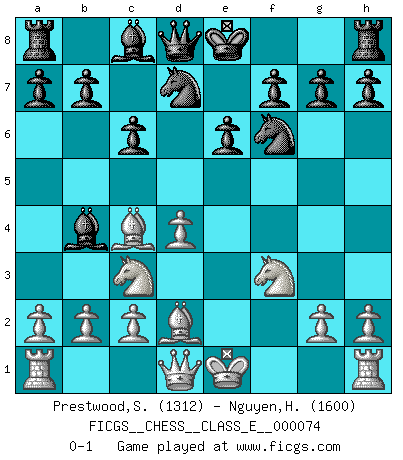 Last move : 0-1 2008 March 18 4:41:49 [Event "FICGS__CHESS__CLASS_E__000074"] [Site "FICGS"] [Date "2008.01.30"] [Round "1"] [White "Prestwood,Scott"] [Black "Nguyen,Hao Nhien"] [Result "0-1"] [WhiteElo "1312"] [BlackElo "1600"] 1.d4 d5 2.e4 dxe4 3.Nc3 Nf6 4.f3 exf3 5.Nxf3 e6 6.Bb5+ c6 7.Bc4 Bb4 8.Bd2 Nbd7 0-1 This chess game has been lost on time (started : 2008.01.30 1:57:18) Blackmar gambit Player Black won this chess game. Follow this game move after move (download)Place the contents of the Chess box in a hat, shake them up vigorously, pour them on the board from a height of two feet, and you get the style of Steinitz. (H. E. Bird) Das typische an einem Großmeister ist, daß er eine gewonnene Position schnell und schmerzlos gewinnt. (Irving Chernev) Antes de los Finales, los dioses han colocado el Juego Medio. (Siegbert Tarrasch) On entre au jeu d'Echecs comme on entre en Religion. Pour le joueur d'Echecs, la partie d'Echecs c'est l'office, la messe, le défilé du 1er Mai, le dépôt de gerbe au Monument aux Morts. C'est un drame sacré. (Michel Roos) Methinks King Thibault should dub Marius Zubac a knight of the square board... I mean table, henceforth addressing him as Sir Marius, and bestow on him a suitable land from the kingdom of FICGS & marry him off to a worthy, fair maiden, lest he slice our heads with his mighty sword in his wrath. (Dinesh De Silva)