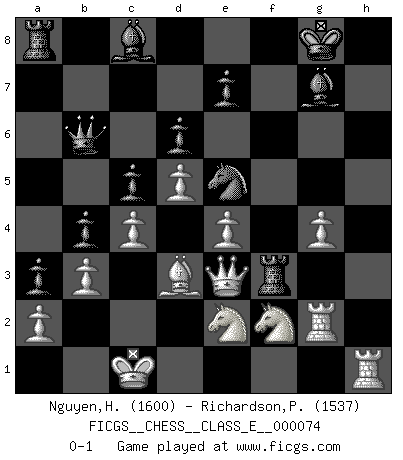 Last move : 0-1 2008 June 4 23:38:54 [Event "FICGS__CHESS__CLASS_E__000074"] [Site "FICGS"] [Date "2008.01.30"] [Round "1"] [White "Nguyen,Hao Nhien"] [Black "Richardson,Patrick"] [Result "0-1"] [WhiteElo "1600"] [BlackElo "1537"] 1.c4 Nf6 2.Nc3 g6 3.d4 Bg7 4.e4 O-O 5.f3 d6 6.Bd3 c5 7.d5 Nbd7 8.Nge2 Ne5 9.Bf4 Nh5 10.Bxe5 Bxe5 11.Qd2 a6 12.O-O-O Bd7 13.f4 Bg7 14.h3 b5 15.g4 Nf6 16.Rdg1 b4 17.Nd1 a5 18.Nf2 a4 19.h4 a3 20.b3 Qc7 21.h5 Bc8 22.f5 Nd7 23.hxg6 hxg6 24.fxg6 Ne5 25.gxf7+ Rxf7 26.Rg2 Qb6 27.Qe3 Rf3 0-1 English Opening Kingside Castling by player Black (move 4) Queenside Castling by player White (move 12) Player Black won this chess game. Follow this game move after move (download)Of all my Russian books, the defense contains and diffuses the greatest 'warmth' which may seem odd seeing how supremely abstract Chess is supposed to be. (Vladimir Nabokov) Die Auseinandersetzung mit Karpow war politisch geprägt. Er stand für das kommunistische System, wurde von dessen Repräsentanten gehätschelt. Ich war der Oppositionelle. Jeder Schachweltmeister spiegelt auch die gesellschaftlichen Verhältnisse wider. Kramnik steht für die Börsen-Generation des Neuen Markts, ideologiefrei, zahlenfixiert. (Garry Kasparov) No puedes jugar al Ajedrez si eres de corazón noble. (Proverbio Francés) Soyez une menace à chaque fois que vous vous asseyez pour jouer. (Ken Smith) Chess is as much a mystery as women. (Purdy)