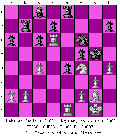 Last move : 1-0 2008 March 15 4:22:33 [Event "FICGS__CHESS__CLASS_E__000074"] [Site "FICGS"] [Date "2008.01.30"] [Round "1"] [White "Webster,David"] [Black "Nguyen,Hao Nhien"] [Result "1-0"] [WhiteElo "1500"] [BlackElo "1600"] 1.c4 c5 2.Nf3 Nf6 3.g3 Nc6 4.Bg2 g6 5.O-O Bg7 6.d4 cxd4 7.Nxd4 O-O 8.Nc3 a6 9.Bf4 Nh5 10.Be3 e5 11.Nxc6 bxc6 12.Bc5 Re8 13.Ne4 Bf8 14.Bxf8 Rxf8 15.Qd6 f5 16.Nc5 Qf6 17.Rfd1 Qxd6 18.Rxd6 Nf6 19.Rad1 Ra7 20.e4 Kf7 21.exf5 gxf5 22.Bh3 Kg6 23.Re1 Re8 24.Nd3 e4 25.Nf4+ Kg5 26.Bg2 Rb7 27.h4+ 1-0 English : Symmetrical variation Kingside Castling by player White (move 5) Kingside Castling by player Black (move 7) Player White won this chess game. Follow this game move after move (download)In Chess, as it is played by masters, chance is practically eliminated. (Emanuel Lasker) Mein Gehirn das ist mein zweitwichtigstes Organ [Aus dem Film: Der Schläfer]. (Woody Allen) No nos podemos resistir a la fascinación de un sacrificio ya que la pasión por los sacrificios es parte de la naturaleza de un jugador de Ajedrez. (Rudolf Spielman) Comme les marins qui ont mille raisons différentes d'aller en mer, les joueurs d'échecs en ont tout autant avant de s'installer devant une table et jouer... (Vincent Bertignac, philosophe) The problem with manipulation is that people can turn on you. (Horatio Caine, C.S.I. Miami)
