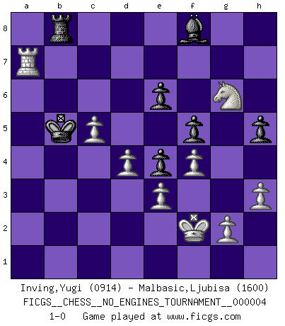 Last move : 1-0 2008 February 29 22:13:11 [Event "FICGS__CHESS__NO_ENGINES_TOURNAMENT__000004"] [Site "FICGS"] [Date "2008.01.30"] [Round "1"] [White "Inving,Yugi"] [Black "Malbasic,Ljubisa"] [Result "1-0"] [WhiteElo "0914"] [BlackElo "1600"] 1.f4 d5 2.e3 Nf6 3.Nf3 g6 4.Nc3 Bg7 5.d3 O-O 6.h3 c6 7.Kf2 Nbd7 8.Bd2 Re8 9.d4 Ne4+ 10.Nxe4 dxe4 11.Nh2 f5 12.c3 Nf6 13.Qb3+ e6 14.Be2 b5 15.a4 a6 16.axb5 cxb5 17.Rhc1 Bd7 18.c4 bxc4 19.Bxc4 Qb8 20.Qxb8 Rexb8 21.Rc2 Nd5 22.Rxa6 Rxa6 23.Bxa6 Bf8 24.Bc4 Bb5 25.b3 Bxc4 26.bxc4 Nb4 27.Bxb4 Rxb4 28.c5 Rb8 29.Nf1 Kf7 30.Nd2 Ke8 31.Ra2 h5 32.Nc4 Kd7 33.Ra7+ Kc6 34.Ne5+ Kb5 35.Nxg6 1-0 Bird's Opening Kingside Castling by player Black (move 5) Player White won this chess game. Follow this game move after move (download)I am the best player in the world and I am here to prove it. (Bobby Fischer) Besser ein falscher Plan, logisch durchgeführt, als gar kein Plan. (Viktor Kortschnoi) El Jaque al descubierto es el bombardero del tablero. (Reuben Fine) Aidez vos pièces, elles vous aideront. (Paul Morphy) Convictions are more dangerous enemies of truth than lies. (Friedrich Nietzsche)