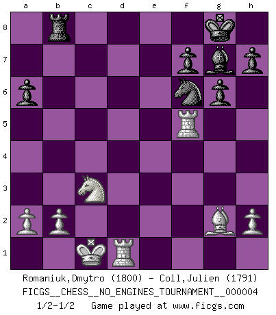 Last move : 1/2-1/2 2008 June 24 10:39:44 [Event "FICGS__CHESS__NO_ENGINES_TOURNAMENT__000004"] [Site "FICGS"] [Date "2008.01.30"] [Round "1"] [White "Romaniuk,Dmytro"] [Black "Coll,Julien"] [Result "1/2-1/2"] [WhiteElo "1800"] [BlackElo "1791"] 1.d4 Nf6 2.c4 g6 3.Nc3 Bg7 4.e4 d6 5.f3 O-O 6.Be3 Nc6 7.Nge2 a6 8.Qd2 Rb8 9.Nc1 e5 10.d5 Nd4 11.N1e2 c5 12.dxc6 bxc6 13.Nxd4 exd4 14.Bxd4 d5 15.cxd5 cxd5 16.O-O-O dxe4 17.Qf4 exf3 18.Be5 fxg2 19.Bxg2 Bd7 20.Bxb8 Qxb8 21.Qxb8 Rxb8 22.Rhf1 Bf5 23.Rxf5 1/2-1/2 King's Indian : Saemisch, Panno formation Kingside Castling by player Black (move 5) Queenside Castling by player White (move 16) This chess game ended in a draw. Follow this game move after move (download)Chess, like love, like music, has the power to make people happy. (Siegbert Tarrasch) Schach ist eine Sache der genauen Beurteilung, wann man zuschlagen und wann man sich ducken muss. (Robert James Fischer) Una partida de Ajedrez se divide en 3 etapas: la primera cuando piensas que tienes la ventaja, la segunda cuando crees que tienes la ventaja y la tercera... ¡cuando te das cuenta que vas a perder!. (Savielly Tartakower) La tactique, c'est ce que vous faites quand il y a quelque chose à faire; la stratégie, c'est ce que vous faites quand il n'y a rien à faire. (Savielli Tartacower) If you ain't just a little scared when you enter a casino, you are either very rich or you haven't studied the games enough. (Pappy)