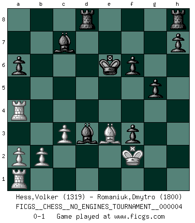 Last move : 0-1 2008 February 14 9:23:26 [Event "FICGS__CHESS__NO_ENGINES_TOURNAMENT__000004"] [Site "FICGS"] [Date "2008.01.30"] [Round "1"] [White "Hess,Volker"] [Black "Romaniuk,Dmytro"] [Result "0-1"] [WhiteElo "1319"] [BlackElo "1800"] 1.e4 c6 2.c4 d5 3.cxd5 cxd5 4.exd5 Nf6 5.Nf3 Nxd5 6.Nc3 Nc6 7.Bb5 Nxc3 8.dxc3 Qxd1+ 9.Kxd1 f6 10.Nd4 a6 11.Bxc6+ bxc6 12.Nxc6 Bb7 13.Nd4 O-O-O 14.Ke2 Bxg2 15.Rg1 Bd5 16.Be3 e5 17.Nf5 g6 18.Nh4 Bc4+ 19.Ke1 Bd6 20.Rg4 Bd3 21.Ra4 e4 22.f3 Bxh2 23.Kf2 g5 24.Nf5 exf3 25.Ne7+ Kd7 26.Nd5 Ke6 27.Nc7+ Bxc7 0-1 Caro-Kann : Anti-anti-Caro-Kann defense Queenside Castling by player Black (move 13) Player Black won this chess game. Follow this game move after move (download)When you play Bobby, it is not a question if you win or lose. It is a question if you survive. (Boris Spassky) Man wirke der falschen Auffassung entgegen, als ob jeder Zug Unmittelbares zu leisten habe; auch Werte- und Ruhezüge haben ihre Existenzberechtigung. (Aaron Nimzowitsch) No puedes jugar al Ajedrez si eres de corazón noble. (Proverbio Francés) Je ne crois pas en la psychologie, je crois aux bons coups. (Robert Fischer) Locking firmely the window serves nothing, only small thiefs pass through there, the big thiefs enter through the front door. (Luc-Olivier Leclerc)