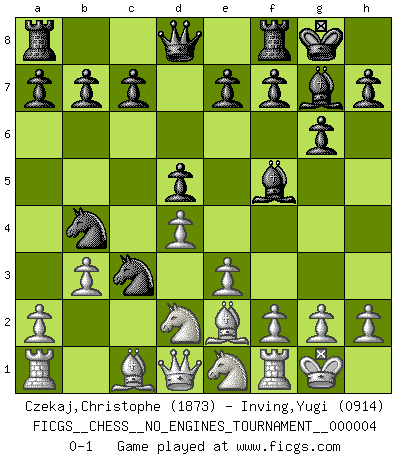 Last move : 0-1 2008 February 26 13:6:30 [Event "FICGS__CHESS__NO_ENGINES_TOURNAMENT__000004"] [Site "FICGS"] [Date "2008.01.30"] [Round "1"] [White "Czekaj,Christophe"] [Black "Inving,Yugi"] [Result "0-1"] [WhiteElo "1873"] [BlackElo "0914"] 1.d4 d5 2.Nf3 Nf6 3.e3 Nc6 4.Bd3 g6 5.O-O Bg7 6.Nbd2 O-O 7.b3 Nb4 8.Be2 Bf5 9.Ne1 Ne4 10.c3 Nxc3 0-1 Queen's pawn game Kingside Castling by player White (move 5) Kingside Castling by player Black (move 6) Player Black won this chess game. Follow this game move after move (download)If one piece is badly posted, the whole game is bad. (Tarrasch) Kostenjuk hat keinen Sexappeal. (Loek van Wely) El Ajedrez es el gimnasio de la mente. (Blaise Pascal) La vérité est comme le meilleur coup aux échecs : elle existe, mais il faut la chercher. (Arturo Perez-Reverte) When you've done things right people won't know you've done anything at all. (Futurama)