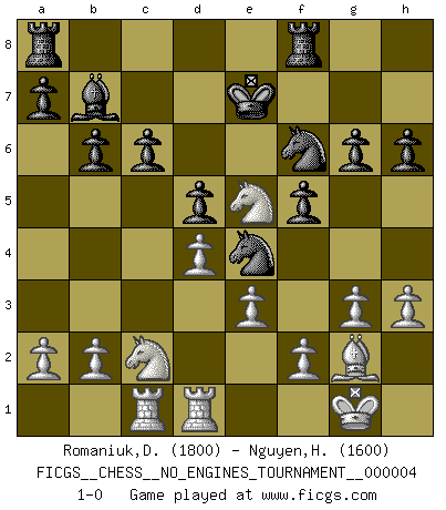 Last move : 1-0 2008 June 4 11:35:28 [Event "FICGS__CHESS__NO_ENGINES_TOURNAMENT__000004"] [Site "FICGS"] [Date "2008.01.30"] [Round "1"] [White "Romaniuk,Dmytro"] [Black "Nguyen,Hao Nhien"] [Result "1-0"] [WhiteElo "1800"] [BlackElo "1600"] 1.d4 d5 2.c4 e6 3.Nc3 Nf6 4.Nf3 b6 5.cxd5 exd5 6.g3 Bb7 7.Qa4+ Qd7 8.Qxd7+ Nbxd7 9.Nb5 Bb4+ 10.Bd2 Bxd2+ 11.Nxd2 Kd8 12.Rc1 Ne8 13.Bh3 c6 14.Na3 g6 15.Nc2 f5 16.O-O Nd6 17.e3 Ne4 18.Nf3 Rf8 19.Bg2 Ke7 20.Rfd1 Ndf6 21.h3 h6 22.Ne5 1-0 QGD : 4.Nf3 Kingside Castling by player White (move 16) Player White won this chess game. Follow this game move after move (download)All that matters on the Chessboard is good moves. (Bobby Fischer) Ich tröste mich mit dem Vergnügen, daß Schachfans, Zuschauer und Leser glücklich sind, wenn ein Großmeister etwas riskiert, statt nur Klötzchen zu schieben. (Mikhail Nekhemyevich Tal) La caracteristica mas importante en la posición del Ajedrez es la actividad de las piezas. Esto es absolutamente fundamental en todas las fases del juego: Apertura, Juego Medio y especialmente Finales. La limitación primordial en la actividad de una pieza, es la estructuración de los Peones. (Michael Stean) Horreur, mais aussi harmonie suprême : qu'y avait-il en effet au monde en dehors des échecs ? Le brouillard, l'inconnu, le non-être... (Vladimir Nabokov) A good player is always lucky. (Capablanca)