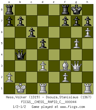 Last move : 1/2-1/2 2008 March 20 14:41:16 [Event "FICGS__CHESS__RAPID_C__000044"] [Site "FICGS"] [Date "2008.01.31"] [Round "1"] [White "Hess,Volker"] [Black "Dsouza,Stanislaus"] [Result "1/2-1/2"] [WhiteElo "1319"] [BlackElo "1367"] 1.e4 d5 2.exd5 Qxd5 3.Nc3 Qd8 4.Nf3 Bg4 5.d3 e6 6.Bf4 Bd6 7.Qd2 Nf6 8.Be2 Bxf3 9.Bxf3 Bxf4 10.Qxf4 O-O 11.O-O-O c6 12.h4 Nd5 13.Nxd5 exd5 14.h5 Nd7 15.g4 Qf6 16.Qg3 Nc5 17.g5 Qd4 18.h6 Na4 19.c3 Nxc3 20.bxc3 Qxc3+ 21.Kb1 Qb4+ 22.Ka1 Qc3+ 23.Kb1 Qb4+ 1/2-1/2 Scandinavian (centre counter) defense Kingside Castling by player Black (move 10) Queenside Castling by player White (move 11) This chess game ended in a draw. Follow this game move after move (download)Bobby is the most misunderstood, misquoted celebrity walking the face of this earth. (Yasser Seirawan) Am wohlsten fühle ich mich, wenn ich sehe, wie sich mein Gegner im Todeskampf windet. (Robert James Fischer) Un entendimiento a fondo de las continuaciones típicas del mate, hace de las combinaciones de sacrificio mas complicadas conducirlas a ellas no solo sin dificultad, sino casi de una manera natural. (Siegbert Tarrasch) Une platitude souvent récitée à propos des Echecs est qu'une des choses les plus difficiles à réaliser est de gagner une position gagnante. Cela ne manque pas de sens mais, pour ma part, j'ai toujours trouvé plus difficile de gagner une position perdante. (Tim Krabbe) There's always a bigger fish. (Qui-Gon Jinn in Star Wars ep.1)