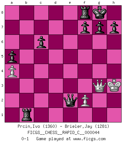Last move : 0-1 2008 February 26 1:37:50 [Event "FICGS__CHESS__RAPID_C__000044"] [Site "FICGS"] [Date "2008.01.31"] [Round "1"] [White "Prcin,Ivo"] [Black "Brieler,Jay"] [Result "0-1"] [WhiteElo "1360"] [BlackElo "1281"] 1.e4 e5 2.Nf3 Nc6 3.Bb5 a6 4.Ba4 Nf6 5.O-O b5 6.Bb3 Nxe4 7.d4 exd4 8.Nxd4 Bc5 9.Qf3 Nf6 10.Re1+ Ne7 11.Nf5 c6 12.Nxe7 Bxe7 13.Bg5 O-O 14.Nc3 d5 15.a4 b4 16.Nd1 Ne4 17.Be3 Qc7 18.c3 Bd6 19.Bc2 Bxh2+ 20.Kf1 a5 21.Bxe4 dxe4 22.Qxe4 bxc3 23.Nxc3 Ba6+ 24.Ne2 Rab8 25.Rab1 Qd6 26.g3 Qf6 27.Qg2 Bxg3 28.Qxg3 Rxb2 29.Bd4 Bxe2+ 30.Kg1 Qxd4 31.Rxe2 Rxb1+ 32.Kg2 Qd1 33.Kh3 Qxe2 0-1 Ruy Lopez : 5.O-O Kingside Castling by player White (move 5) Kingside Castling by player Black (move 13) Player Black won this chess game. Follow this game move after move (download)If cunning alone were needed to excel, women would be the best Chess players. (Albin) Das Schachspiel ist ein See, in welchem eine Mücke baden und ein Elefant ertrinken kann. (Emanuel Lasker) El juego del Ajedrez no es solamente una diversión quieta; algunas cualidades muy valuables de la mente se pueden adquirir y cultivar con el, como convertirlos en habitos disponibles para toda ocasión; ya que la vida es algo así como el Ajedrez. (Benjamin Franklin) Il n'y a pas de prix trop élevé au scalp de l'ennemi. (Koblentz) You know what they say : You lie down with the Devil, you wake up in Hell. (Horatio Caine, C.S.I. Miami)