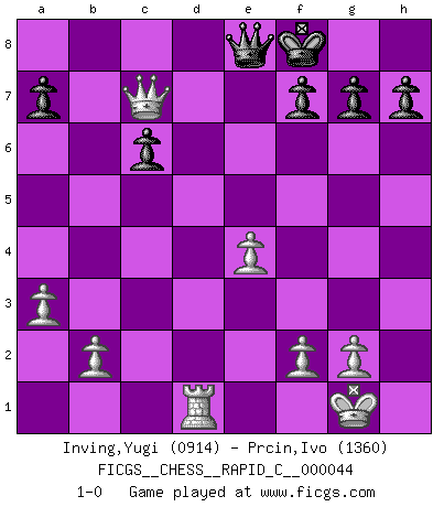 Last move : 1-0 2008 February 26 7:48:14 [Event "FICGS__CHESS__RAPID_C__000044"] [Site "FICGS"] [Date "2008.01.31"] [Round "1"] [White "Inving,Yugi"] [Black "Prcin,Ivo"] [Result "1-0"] [WhiteElo "0914"] [BlackElo "1360"] 1.h4 d5 2.d3 e5 3.Nf3 Nc6 4.e3 Be7 5.Be2 Nf6 6.O-O O-O 7.Nc3 d4 8.exd4 exd4 9.Ne4 Nxe4 10.dxe4 Bxh4 11.Bf4 Re8 12.Nxh4 Qxh4 13.Qd2 Qe7 14.Rfe1 Be6 15.Rac1 Rac8 16.a3 Qf6 17.Bb5 Bd7 18.c3 dxc3 19.Rxc3 Red8 20.Bg5 Qg6 21.Bxc6 bxc6 22.Bxd8 Rxd8 23.Rd3 Qe6 24.Rd1 Kf8 25.Rxd7 Rb8 26.Rd8+ Rxd8 27.Qxd8+ Qe8 28.Qxc7 1-0 Anti-Borg (Desprez) Opening Kingside Castling by player White (move 6) Kingside Castling by player Black (move 6) Player White won this chess game. Follow this game move after move (download)Don't even mention losing to me. I can't stand to think of it. (Bobby Fischer) Ich hatte meine größten Erfolge, als ich 47 Jahre alt war. Kasparow war noch nicht mal 42 und hat das Schach schon im Stich gelassen. (Viktor Kortschnoi) Bobby es la celebridad menos entendida y malinterpretada que camina el la faz de esta tierra. (Yasser Seirawan) Ce qui caractérise les parties de combat, c'est que si le défenseur a constamment de difficiles problèmes à résoudre, l'attaquant doit chercher sans relâche de nouvelles possibilités d'attaque. (Koblentz) The arrogant army will lose certainly the battle. (Chinese proverb)