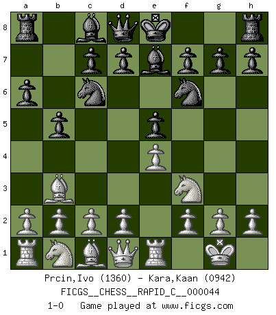 Last move : 1-0 2008 March 12 16:1:13 [Event "FICGS__CHESS__RAPID_C__000044"] [Site "FICGS"] [Date "2008.01.31"] [Round "1"] [White "Prcin,Ivo"] [Black "Kara,Kaan"] [Result "1-0"] [WhiteElo "1360"] [BlackElo "0942"] 1.e4 e5 2.Nf3 Nc6 3.Bb5 Nf6 4.O-O a6 5.Ba4 b5 6.Bb3 Be7 7.Re1 1-0 This chess game has been lost on time (started : 2008.01.31 18:12:26) Ruy Lopez : Berlin defense, 4.O-O Kingside Castling by player White (move 4) Player White won this chess game. Follow this game move after move (download)In Chess, just as in life, today's bliss may be tomorrow's poison. (Assaic) In der Schule lernt man nichts. Es ist nur Zeitverschwendung. (Robert James Fischer) Vive, pierde y aprende al observar a tu oponente como ganar. (Amber Steenbock) Les Cavaliers se révèlent fort utiles dans les positions fermées. D'habitude, les Fous sont un peu plus forts que les Cavaliers dans les positions ouvertes. Qu'on le veuille ou non, il restera toujours des exceptions ! There is a great deal of difference between an eager man who wants to read a book and a tired man who wants a book to read. (G.K. Chesterton)