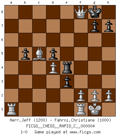 Last move : 1-0 2006 November 3 22:8:39 [Event "FICGS__CHESS__RAPID_C__000004"] [Site "FICGS"] [Date "2006.07.02"] [Round "1"] [White "Herr,Jeff"] [Black "Fahrni,Christiane"] [Result "1-0"] [WhiteElo "1200"] [BlackElo "1000"] 1.d4 d5 2.c4 e6 3.e3 Nc6 4.Nf3 Nf6 5.cxd5 exd5 6.Bb5 Bd6 7.O-O O-O 8.Nc3 Ne4 9.Nxe4 Qe7 10.Nxd6 Qxd6 11.Bxc6 Qxc6 12.Ne5 Qe8 13.Qf3 f6 14.Nd3 Be6 15.Nc5 b6 16.Nxe6 Qxe6 17.Bd2 Rae8 18.Bb4 Rf7 19.a4 a5 20.Ba3 c6 21.b4 Qe4 22.Qxe4 Rxe4 23.bxa5 b5 24.axb5 cxb5 25.Bc5 f5 26.a6 f4 27.a7 fxe3 28.a8Q+ Rf8 29.Qxf8+ 1-0 Queen's gambit declined Kingside Castling by player White (move 7) Kingside Castling by player Black (move 7) Promotion Queen by player White (move 28) Player White won this chess game. Follow this game move after move (download)A sacrifice is best refuted by accepting it. (Wilhelm Steinitz) Es ist schade, dass viele Schachsportler vergessen, wie wichtig Auftreten und angemessene Kleidung sind. (Alexandra Kosteniuk) Un mal día en el Ajedrez, es mejor que cualquier buen día en el trabajo. (Anonymous) Les échecs c'est le défi de l'alpiniste, toujours plus haut, prêt à tout pour monter à l'assaut du Roi ennemi. Les échecs, c'est de la musique en mouvement, un ballet majestueux pour les yeux. C'est de la poésie composée par les fantômes du passé qui au même titre que Rimbaud ou Verlaine méritent notre admiration. Les échecs, c'est de la peinture ou le moindre mouvement modifie le tableau pour en faire un Picasso ou un Van Gogh. Les échecs, c'est tout et rien, c'est la vie et la mort. Jjulie33 sur le forum de France-Echecs. Computers are like Old Testament gods; lots of rules and no mercy. (Joseph Campbell)