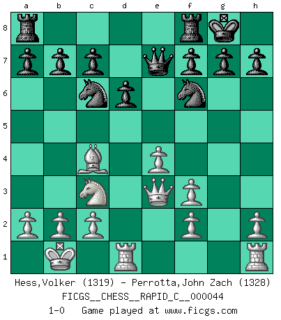 Last move : 1-0 2008 March 14 16:4:42 [Event "FICGS__CHESS__RAPID_C__000044"] [Site "FICGS"] [Date "2008.01.31"] [Round "1"] [White "Hess,Volker"] [Black "Perrotta,John Zach"] [Result "1-0"] [WhiteElo "1319"] [BlackElo "1328"] 1.e4 e5 2.d4 exd4 3.Qxd4 Nc6 4.Qd3 Bc5 5.Nf3 d6 6.Nc3 Bg4 7.Be3 Bxf3 8.gxf3 Bxe3 9.Qxe3 Nf6 10.O-O-O O-O 11.Kb1 Qe7 12.Bc4 1-0 This chess game has been lost on time (started : 2008.01.31 18:12:26) Centre game Queenside Castling by player White (move 10) Kingside Castling by player Black (move 10) Player White won this chess game. Follow this game move after move (download)I have always a slight feeling of pity for the man who has no knowledge of Chess. (Siegbert Tarrasch) Ich habe Kasparov in Rente geschickt. (Veselin Topalov) El Jaque al descubierto es el bombardero del tablero. (Reuben Fine) Je ne crois pas en la psychologie, je crois aux bons coups. (Robert Fischer) He who is a good ruler must first have been ruled. (Aristotle)