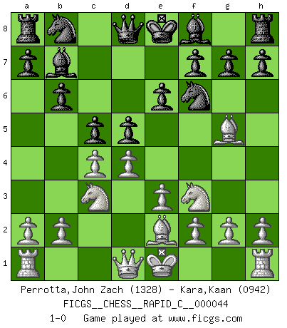 Last move : 1-0 2008 March 26 5:5:45 [Event "FICGS__CHESS__RAPID_C__000044"] [Site "FICGS"] [Date "2008.01.31"] [Round "1"] [White "Perrotta,John Zach"] [Black "Kara,Kaan"] [Result "1-0"] [WhiteElo "1328"] [BlackElo "0942"] 1.c4 Nf6 2.Nc3 b6 3.d4 d5 4.Nf3 Bb7 5.Bg5 e6 6.e3 c5 7.Be2 1-0 This chess game has been lost on time (started : 2008.01.31 18:12:26) English Opening Player White won this chess game. Follow this game move after move (download)Whoever sees no other aim in the game than that of giving checkmate to one's opponent will never become a good Chess player. (Euwe) Computer sind die einzigen Gegner, die nicht immer eine Ausrede auf Lager haben, wenn sie gegen mich verlieren. (Robert James Fischer) Fischer es una tragedia del Ajedrez Americano a la par con Morphy y Pillsbury. (Mig Greengard) Même si vous avez un bon coup à faire, regardez toujours s'il n'y en a pas un qui lui soit préférable. (Pedro Damiano) Tree pose grows confidence. It roots me to this world. (Terri Guillemets)