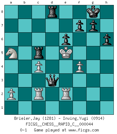 Last move : 0-1 2008 March 12 14:53:0 [Event "FICGS__CHESS__RAPID_C__000044"] [Site "FICGS"] [Date "2008.01.31"] [Round "1"] [White "Brieler,Jay"] [Black "Inving,Yugi"] [Result "0-1"] [WhiteElo "1281"] [BlackElo "0914"] 1.e4 e6 2.d4 d5 3.Nc3 Nf6 4.Bg5 dxe4 5.Nxe4 Nbd7 6.Nf3 h6 7.Bh4 Be7 8.Bd3 Nxe4 9.Bxe7 Qxe7 10.Bxe4 Nf6 11.Qd3 Nxe4 12.Qxe4 Qb4+ 13.Nd2 Qxb2 14.Nb3 Qc3+ 15.Kd1 Bd7 16.Qxb7 Bc6 17.Qxc7 Bf3+ 18.gxf3 Qxc7 19.Re1 Rc8 20.Rc1 Qxh2 21.Re2 Qh1+ 22.Kd2 Qxf3 23.c4 a5 24.Nxa5 Qa3 25.Nb7 Qb2+ 26.Rc2 Qxd4+ 27.Kc1 O-O 28.Na5 Qa1+ 29.Kd2 Rfd8+ 30.Ke3 Qe5+ 31.Kf3 Qh5+ 32.Ke3 Qg5+ 33.f4 Qg3+ 34.Ke4 Qd3+ 35.Ke5 Rc5+ 0-1 French : Burn variation Kingside Castling by player Black (move 27) Player Black won this chess game. Follow this game move after move (download)The stomach is an essential part of the Chess master. (Bent Larsen) Der 70jährige Viktor Kortschnoi: Die Rentenanstalt wollte mich zwingen in Rente zu gehen. Meine Frau erhält jetzt eine Pension- und ich zahle weiter in die Rentenkasse ein! (Viktor Kortschnoi) ¿Se han dado cuenta de que Fischer casi nunca ha tenido piezas malas? El las intercambia y las piezas malas se quedan con sus oponenets. (Yuri Balashov) Le plus grand jeu de l'esprit jamais inventé, plus vous l'apprenez, plus vous y prenez du plaisir. (Garry Kasparov) Those who make the worst use of their time are the first to complain of its brevity. (Jean de la Bruyere)