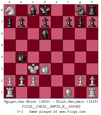 Last move : 0-1 2008 March 15 4:24:33 [Event "FICGS__CHESS__RAPID_B__000083"] [Site "FICGS"] [Date "2008.02.01"] [Round "1"] [White "Nguyen,Hao Nhien"] [Black "Block,Benjamin"] [Result "0-1"] [WhiteElo "1800"] [BlackElo "1419"] 1.e4 e5 2.Nf3 Nc6 3.Nc3 Nf6 4.Nxe5 Nxe5 5.d4 Nc6 6.d5 Ne5 7.f4 Ng6 8.e5 Ng8 9.d6 cxd6 10.exd6 Qf6 11.Nb5 Nxf4 12.Nc7+ Kd8 13.Bxf4 Qxf4 14.Nxa8 Qh4+ 15.Kd2 Qf4+ 16.Kc3 Bxd6 17.Qd3 Qb4+ 0-1 Four knights : Schultze-Mueller gambit Player Black won this chess game. Follow this game move after move (download)Whoever sees no other aim in the game than that of giving checkmate to one's opponent will never become a good Chess player. (Euwe) Korrekt heißt in Deutschland die Haltung eines Mannes, dessen Benehmen nach dem Urteile seiner Nachbarn seiner Stellung angemessen ist. Um korrekt zu sein, muß man sich der Meinung der anderen anpassen... (Emanuel Lasker) Los asuntos humanos son como una partida de Ajedrez: solo aquellos que no lo toman seriamente, pueden ser llamados buenos jugadores. (Hung Tzu Ch'eng) La solitude du joueur d'Echecs à l'approche du mat est semblable à celle du condamné. (Francis Szpiner) Dave, my mind is going. I can feel it. (HAL 9000 in 2001, a space odyssey)