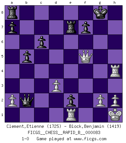 Last move : 1-0 2008 February 18 21:0:49 [Event "FICGS__CHESS__RAPID_B__000083"] [Site "FICGS"] [Date "2008.02.01"] [Round "1"] [White "Clement,Etienne"] [Black "Block,Benjamin"] [Result "1-0"] [WhiteElo "1725"] [BlackElo "1419"] 1.e4 e5 2.f4 exf4 3.Bc4 Nf6 4.d3 d5 5.exd5 Nxd5 6.Nf3 Bb4+ 7.c3 Be7 8.O-O Nc6 9.Nd4 Nxd4 10.cxd4 O-O 11.Nc3 Ne3 12.Bxe3 fxe3 13.Qh5 Bf6 14.Ne4 Qxd4 15.Rae1 Bd7 16.Nxf6+ gxf6 17.Rf3 b5 18.Bd5 c6 19.Be4 f5 20.Bxf5 e2 21.Kh1 Bxf5 22.Qxf5 Qxb2 23.Rh3 Rfe8 24.Rxh7 Re7 25.Rh4 1-0 KGA : Bishop's gambit, Cozio (Morphy) defense Kingside Castling by player White (move 8) Kingside Castling by player Black (move 10) Player White won this chess game. Follow this game move after move (download)Some sacrifices are sound; the rest are mine. (Mikhail Tal) Was ist der Unterschied zwischen einem Strassenarbeiter und einem Schachspieler? --Der Schachspieler bewegt sich ab und zu. (Anonymous) Botvinnik trató de alejar el misterio referente al Ajedrez, siempre relacionandolo a situaciones de la vida diaria. Solía llamar al Ajedrez un problema inexacto típico, similar a aquellos en que la gente tiene siempre que resolver a cada día. (Garry Kasparov) Les Echecs sont affaire de jugement sensible. Savoir quand frapper et quand esquiver. (Fischer) The best teachers teach from the heart, not from the book. (Author unknown)