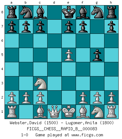 Last move : 1-0 2008 February 3 16:30:20 [Event "FICGS__CHESS__RAPID_B__000083"] [Site "FICGS"] [Date "2008.02.01"] [Round "1"] [White "Webster,David"] [Black "Lugomer,Anita"] [Result "1-0"] [WhiteElo "1500"] [BlackElo "1800"] 1.e4 g5 2.d4 d5 3.exd5 Qxd5 4.Nc3 Qe5+ 5.dxe5 1-0 Reversed Grob (Borg/Basman defense/macho Grob) Player White won this chess game. Follow this game move after move (download)We cannot resist the fascination of sacrifice, since a passion for sacrifices is part of a Chessplayer's nature. (Rudolf Spielman) Schach ist das schnellste Spiel der Welt, weil man in jeder Sekunde Tausende von Gedanken ordnen muß. (Albert Einstein) En partidas rápidas, el Caballo es mas poderoso que el Alfil. (Vlastimil Hort) Les échecs sont un jeu par leur forme, un art par leur essence et une science par sa difficulté d'acquisition. Ils peuvent vous procurer autant de plaisir qu'un bon livre ou une belle musique, mais vous n'aurez une réelle joie que si vous arrivez à bien jouer. (Tigran Petrosian) Good decisions come from experience, and experience comes from bad decisions. (Anonymous)