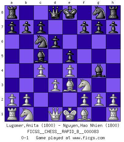 Last move : 0-1 2008 March 11 3:54:51 [Event "FICGS__CHESS__RAPID_B__000083"] [Site "FICGS"] [Date "2008.02.01"] [Round "1"] [White "Lugomer,Anita"] [Black "Nguyen,Hao Nhien"] [Result "0-1"] [WhiteElo "1800"] [BlackElo "1800"] 1.e4 e5 2.d3 Nc6 3.Nf3 Bc5 4.Be3 d6 5.c4 Bg4 0-1 This chess game has been lost on time (started : 2008.02.01 9:31:41) Variation Indian Opening : Indian Opening Player Black won this chess game. Follow this game move after move (download)The laws of Chess do not permit a free choice: you have to move whether you like it or not. (Emanuel Lasker) Alle Schachspieler sollten auch ein Hobby haben. (Savielly Grigorievitsch Tartakower) Cuando tu casa esta en llamas, no puedes ser molestado por tus vecinos. O, como decinos en Ajedrez, si tu Rey esta bajo ataque, no te preocupa perder un Peón del lado de la Reina. (Gary Kasparov) Le génie consiste à savoir transgresser les règles au moment opportun. (Teichmann) When a man with money meets a man with experience, the man with experience leaves with money and the man with money leaves with experience. (Anonymous)
