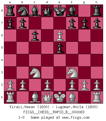 Last move : 1-0 2008 March 13 4:2:4 [Event "FICGS__CHESS__RAPID_B__000083"] [Site "FICGS"] [Date "2008.02.01"] [Round "1"] [White "Kirali,Hasan"] [Black "Lugomer,Anita"] [Result "1-0"] [WhiteElo "1600"] [BlackElo "1800"] 1.e4 Nf6 2.e5 Nd5 3.c4 d6 4.cxd5 dxe5 5.Nc3 c6 6.Nf3 e6 7.dxe6 1-0 This chess game has been lost on time (started : 2008.02.01 9:31:41) Alekhine's defense Player White won this chess game. Follow this game move after move (download)Discovered check is the dive bomber of the Chessboard. (Reuben Fine) Die Elozahlen sind sehr schlecht für das Schach. Jetzt ist Schach eine Sportindustrie, die darauf zielt Elopunkte zu machen. (Miguel Najdorf) El estómago es una parte esencial del maestro de Ajedrez. (Bent Larsen) On n'a jamais que l'âge auquel on a commence à jouer aux échecs car après on cesse de vieillir. (Capablanca) In my experience, there's no such thing as luck. (Obi-Wan Kenobi in Star Wars ep.4)