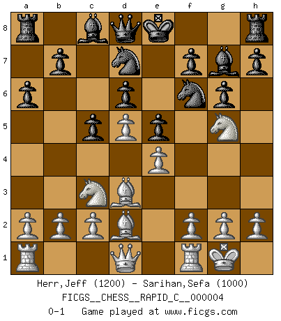 Last move : 0-1 2006 August 6 21:17:41 [Event "FICGS__CHESS__RAPID_C__000004"] [Site "FICGS"] [Date "2006.07.02"] [Round "1"] [White "Herr,Jeff"] [Black "Sarihan,Sefa"] [Result "0-1"] [WhiteElo "1200"] [BlackElo "1000"] 1.d4 d6 2.e4 Nf6 3.Bd3 c6 4.Nc3 g6 5.Nf3 Bg7 6.O-O Nbd7 7.Bd2 a6 8.Ng5 e5 9.d5 c5 10.dxc6 bxc6 11.f4 exf4 12.Bxf4 Ne5 13.Kh1 h5 14.Nf3 Bg4 15.Bxe5 dxe5 16.h3 Qe7 17.Ne2 Rd8 18.Qc1 Bxf3 19.Rxf3 a5 20.Qf1 O-O 21.Qf2 Nh7 22.h4 g5 23.g3 g4 24.Rf5 Nf6 25.Rf1 Rd6 0-1 Queen's Pawn Kingside Castling by player White (move 6) Follow this game move after move (download)A great player and a great example for many. His book My 60 Memorable Games had a big impact on me. It is a shame he didn't continue to enrich the world of chess with his unparalleled understanding after 1972. (Jan Timman, about Bobby Fischer's death) Ich bin es gewohnt, das die Jugend mir überhaupt keinen Respekt entgegenbringt. (Alexander Morozewich) El tablero es el mundo, las piezas es el fenomeno del universo, las reglas del juego son lo que llamamos leyes de la naturaleza y el jugador del lado opuesto, se encuentra oculto a nuestra vista. (Thomas Huxley) Les échecs, c'est la lutte contre l'erreur. (Johannes Zukertort) Chess is as much a mystery as women. (Purdy)