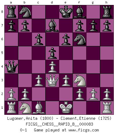 Last move : 0-1 2008 March 12 16:1:13 [Event "FICGS__CHESS__RAPID_B__000083"] [Site "FICGS"] [Date "2008.02.01"] [Round "1"] [White "Lugomer,Anita"] [Black "Clement,Etienne"] [Result "0-1"] [WhiteElo "1800"] [BlackElo "1725"] 1.Nf3 d5 2.d4 Nf6 3.e3 e6 4.Bb5+ Bd7 5.Qd3 c6 6.Ba4 Qa5+ 7.c3 Qxa4 0-1 This chess game has been lost on time (started : 2008.02.01 9:31:41) Reti Opening Player Black won this chess game. Follow this game move after move (download)Without error there can be no brilliancy. (Emanuel Lasker) Zeige mir drei Eröffnungsvarianten und ich beweise dir, dass zwei davon inkorrekt sind. (Emanuel Lasker) Las leyes del Ajedrez no permiten una libre elección: tienes que mover quieras o no. (Emanuel Lasker) Il (Jacob Murray) ne joue pas pour le bon coup, mais pour le meilleur. (Eloi Relange) I just play for fun. (Anna Kournikova)