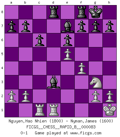 Last move : 0-1 2008 March 1 3:46:56 [Event "FICGS__CHESS__RAPID_B__000083"] [Site "FICGS"] [Date "2008.02.01"] [Round "1"] [White "Nguyen,Hao Nhien"] [Black "Nyman,James"] [Result "0-1"] [WhiteElo "1800"] [BlackElo "1600"] 1.e4 c6 2.d4 d5 3.Nc3 dxe4 4.Nxe4 Bf5 5.Ng3 Bg6 6.Bc4 e6 7.Nf3 Nf6 8.O-O Nbd7 9.Re1 Be7 10.Ne5 Nxe5 11.dxe5 Qxd1 12.Rxd1 Nd7 13.f4 Bxc2 14.Re1 Nb6 15.Bf1 O-O 16.Be3 Nd5 17.Rac1 Nxe3 18.Kh1 Nxf1 19.Rxf1 Bd3 20.Rfd1 Rad8 0-1 Caro-Kann : Classical variation Kingside Castling by player White (move 8) Kingside Castling by player Black (move 15) Player Black won this chess game. Follow this game move after move (download)There are two types of sacrifices: correct ones and mine. (Mikhail Tal) Das Schachspiel übertrifft alle anderen Spiele so weit wie der Chimborasso einen Misthaufen. (Arthur Schopenhauer) Ayuda a tus piezas para que ellas te puedan ayudar. (Paul Morphy) Je menace de comprendre la position. (Anonyme) The good fighters of old first put themselves beyond the possibility of defeat, and then waited for an opportunity of defeating the enemy. (Sun Tzu)