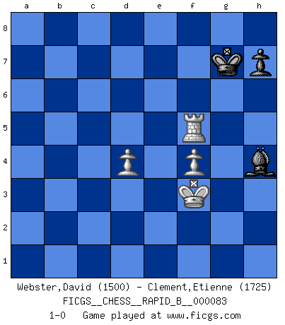 Last move : 1-0 2008 March 26 1:43:56 [Event "FICGS__CHESS__RAPID_B__000083"] [Site "FICGS"] [Date "2008.02.01"] [Round "1"] [White "Webster,David"] [Black "Clement,Etienne"] [Result "1-0"] [WhiteElo "1500"] [BlackElo "1725"] 1.d4 Nf6 2.c4 e6 3.Nc3 Bb4 4.e3 O-O 5.Nf3 d5 6.Be2 c5 7.O-O Nc6 8.cxd5 exd5 9.dxc5 Bxc5 10.b3 Re8 11.Bb2 Be6 12.Rc1 Qe7 13.Na4 Bb4 14.Ne5 Nxe5 15.Bxe5 Bf5 16.Bf4 Rec8 17.Qd4 Bc2 18.Bd3 Bxd3 19.Qxd3 Qe4 20.Qb5 b6 21.Rxc8+ Rxc8 22.Qa6 Rc2 23.Qxa7 b5 24.Nb6 Bf8 25.Qb8 Qe6 26.a4 bxa4 27.bxa4 Rb2 28.a5 Nd7 29.Qd8 Nxb6 30.axb6 Rxb6 31.Rd1 Rb5 32.h3 Rc5 33.Qa8 Qd7 34.Rb1 Rc8 35.Qb7 Qxb7 36.Rxb7 Rd8 37.Be5 f6 38.Bd4 Bd6 39.f4 Kf8 40.Kf2 Be7 41.Kf3 Ke8 42.g4 Rd7 43.Rb8+ Kf7 44.h4 f5 45.g5 Bd6 46.Rh8 Kg6 47.Rg8 Bc7 48.h5+ Kxh5 49.Bxg7 Rd8 50.Bf8 Rd7 51.Bc5 Bd8 52.Bd4 Rd6 53.g6 Kh6 54.Be5 Rd7 55.g7 Bh4 56.Rf8 Rxg7 57.Bxg7+ Kxg7 58.Rxf5 d4 59.exd4 1-0 Nimzo-Indian : 4.e3 e8g8, 5.Nf3 d7d5 Kingside Castling by player Black (move 4) Kingside Castling by player White (move 7) 10 pieces endgame at move 57 : White KRBPP , Black KBPPP WHITE : King + 1 Rook 1 Bishop 2 Pawns BLACK : King + 1 Bishop 3 Pawns 9 pieces endgame at move 57 : White KRPP , Black KBPPP WHITE : King + 1 Rook 2 Pawns BLACK : King + 1 Bishop 3 Pawns 8 pieces endgame at move 58 : White KRPP , Black KBPP WHITE : King + 1 Rook 2 Pawns BLACK : King + 1 Bishop 2 Pawns 7 pieces endgame at move 59 : White KRPP , Black KBP WHITE : King + 1 Rook 2 Pawns BLACK : King + 1 Bishop 1 Pawn Player White won this chess game. Follow this game move after move (download)For me, Chess is life and every game is like a new life. Every Chess player gets to live many lives in one lifetime. (Eduard Gufeld) Du kannst im Schach nur gut werden, wenn du das Spiel liebst. (Robert James Fischer) No hay otro maestro que tenga una voluntad terrífica de ganar. Al tablero, el irradía peligro y aún los oponentes mas fuertes tienden a congelarse como liebres cuando olfatean a una pantera. Aún sus debilidades son peligrosas. Con las blancas, su juego de apertura es predecible - te es posible hacer planes en su contra - pero es tan fuerte que tus planes casi nunca funcionan. En el juego medio, su precisión e invención son fabulosas y en finales, tú simplemente no le puedes vencer. (Experto Alemán anónimo) Le plus grand jeu de l'esprit jamais inventé, plus vous l'apprenez, plus vous y prenez du plaisir. (Garry Kasparov) Games, world of games... There's always an opponent, and there's always a victim. (Revolver, movie)