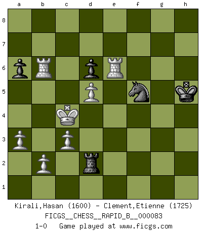 Last move : 1-0 2008 March 12 2:0:36 [Event "FICGS__CHESS__RAPID_B__000083"] [Site "FICGS"] [Date "2008.02.01"] [Round "1"] [White "Kirali,Hasan"] [Black "Clement,Etienne"] [Result "1-0"] [WhiteElo "1600"] [BlackElo "1725"] 1.e4 e5 2.d4 exd4 3.Qxd4 Nc6 4.Qe3 Nf6 5.Nc3 Bb4 6.Bd2 O-O 7.O-O-O d6 8.Bc4 Be6 9.Be2 Re8 10.a3 Bc5 11.Qg3 Bd7 12.Bh6 g6 13.f3 Be6 14.f4 Bd4 15.h4 Bd7 16.h5 Qe7 17.hxg6 fxg6 18.Bg5 Qf7 19.Bxf6 Bxf6 20.Nf3 a6 21.Ng5 Bxg5 22.Qxg5 Rf8 23.Rh4 Rae8 24.Rdh1 Nd4 25.Bc4 Be6 26.Nd5 Bxd5 27.Bxd5 Ne6 28.Qg3 c6 29.Rxh7 Qxf4+ 30.Qxf4 Rxf4 31.Rh8+ Kf7 32.R1h7+ Kf6 33.Rxe8 cxd5 34.exd5 Nd4 35.Rxb7 Rf1+ 36.Kd2 Rg1 37.Kd3 Rd1+ 38.Kc4 Nf5 39.c3 Kg5 40.Re2 Ng3 41.Re6 Nf5 42.g4 Kxg4 43.Rxg6+ Kh5 44.Re6 Rd2 45.Rb6 1-0 Centre game : Berger variation Kingside Castling by player Black (move 6) Queenside Castling by player White (move 7) Player White won this chess game. Follow this game move after move (download)Good offense and good defense both begin with good development. (Bruce A. Moon) Schach ist ein Kampf gegen den Fehler. (Johannes Herrman Zukertort) Es muy difícil jugar en contra de la teoría de Einstein. - en su primera derrota en contra de Fischer (Mikhail Tal) On est toujours la mazette de quelqu'un d'autre. (Anonyme) Logic : The art of thinking and reasoning in strict accordance with the limitations and incapacities of the human misunderstanding. (Ambrose Bierce)
