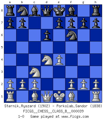 Last move : 1-0 2008 March 18 4:41:49 [Event "FICGS__CHESS__CLASS_B__000039"] [Site "FICGS"] [Date "2008.02.04"] [Round "1"] [White "Sternik,Ryszard"] [Black "Porkolab,Sandor"] [Result "1-0"] [WhiteElo "1902"] [BlackElo "1838"] 1.e4 c5 2.Nf3 d6 3.d4 cxd4 4.Nxd4 Nf6 5.Nc3 1-0 This chess game has been lost on time (started : 2008.02.04 3:22:31) Sicilian Player White won this chess game. Follow this game move after move (download)A thorough understanding of the typical mating continuations makes the most complicated sacrificial combinations leading up to them not only not difficult, but almost a matter of course. (Siegbert Tarrasch) Fallen sollten polizeilich verboten werden. (Savielly Grigorievitsch Tartakower) Aquel que ve no otra dirección en el juego que la de dar Jaque Mate a su oponente, nunca será un buen jugador de Ajedrez. (Euwe) Le thème de l'attaque double intervient d'une manière ou d'une autre dans l'immense majorité des combinaisons. (Youri Averbakh) The beginning is the most important part of the work. (Plato)