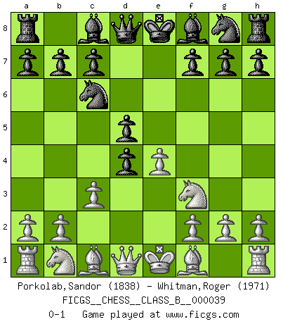 Last move : 0-1 2008 March 18 4:41:49 [Event "FICGS__CHESS__CLASS_B__000039"] [Site "FICGS"] [Date "2008.02.04"] [Round "1"] [White "Porkolab,Sandor"] [Black "Whitman,Roger"] [Result "0-1"] [WhiteElo "1838"] [BlackElo "1971"] 1.e4 e5 2.Nf3 Nc6 3.d4 exd4 4.c3 d5 0-1 This chess game has been lost on time (started : 2008.02.04 3:22:31) Scotch : Goering gambit Player Black won this chess game. Follow this game move after move (download)If one piece is badly posted, the whole game is bad. (Tarrasch) Ivan Sokolov treibt mich als Beifahrer an mit go Loeky go - . (Loek van Wely) Las leyes del Ajedrez no permiten una libre elección: tienes que mover quieras o no. (Emanuel Lasker) Les Echecs sont et restent toujours un combat, un combat intégral comme la boxe, la lutte ou un autre sport, et où il doit y avoir un vainqueur et un vaincu. (Joseph Emil Diemer) Begin at the beginning and go on till you come to the end; then stop. (Lewis Carrol, Alice in Wonderland)