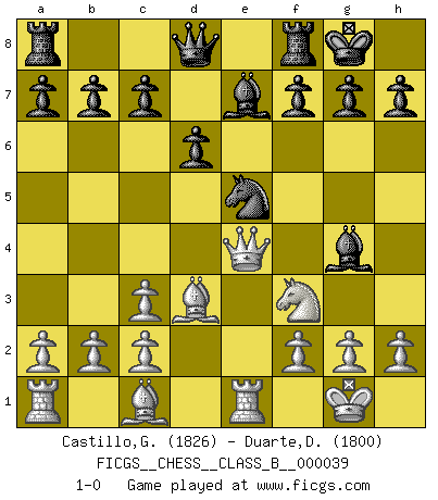 Last move : 1-0 2008 March 22 22:21:43 [Event "FICGS__CHESS__CLASS_B__000039"] [Site "FICGS"] [Date "2008.02.04"] [Round "1"] [White "Castillo,German"] [Black "Duarte,Duarte Nuno"] [Result "1-0"] [WhiteElo "1826"] [BlackElo "1800"] 1.e4 e5 2.Nf3 Nf6 3.Nxe5 d6 4.Nf3 Nxe4 5.Nc3 Nxc3 6.dxc3 Be7 7.Bd3 O-O 8.O-O Bg4 9.Re1 Nd7 10.Qe2 Ne5 11.Qe4 1-0 Petrov : Nimzovich attack Kingside Castling by player Black (move 7) Kingside Castling by player White (move 8) Player White won this chess game. Follow this game move after move (download)I'm not afraid of Spassky. The world knows I'm the best. You don't need a match to prove it. (Bobby Fischer) Am wohlsten fühle ich mich, wenn ich sehe, wie sich mein Gegner im Todeskampf windet. (Robert James Fischer) Jugadores de primera clase pierden en contra de jugadores de segunda clase porque los jugadores de segunda clase a veces juegan una partida de primer clase. (Siegbert Tarrasch) Une platitude souvent récitée à propos des Echecs est qu'une des choses les plus difficiles à réaliser est de gagner une position gagnante. Cela ne manque pas de sens mais, pour ma part, j'ai toujours trouvé plus difficile de gagner une position perdante. (Tim Krabbe) There is a great deal of difference between an eager man who wants to read a book and a tired man who wants a book to read. (G.K. Chesterton)