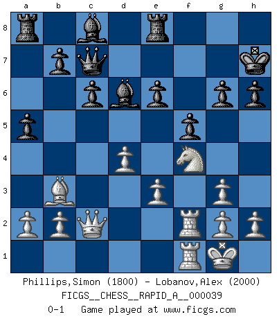 Last move : 0-1 2008 May 2 21:6:7 [Event "FICGS__CHESS__RAPID_A__000039"] [Site "FICGS"] [Date "2008.02.07"] [Round "1"] [White "Phillips,Simon"] [Black "Lobanov,Alex"] [Result "0-1"] [WhiteElo "1800"] [BlackElo "2000"] 1.d4 Nf6 2.c4 e6 3.Nf3 d5 4.Nc3 Be7 5.Bg5 h6 6.Bh4 c6 7.e3 O-O 8.Bd3 dxc4 9.Bxc4 Nbd7 10.O-O Nd5 11.Bg3 Qa5 12.Rc1 N7f6 13.Ne5 Nxc3 14.Rxc3 Ne4 15.Rc2 Nxg3 16.fxg3 Bd6 17.Bb3 Qc7 18.Ng4 f5 19.Nf2 Kh7 20.Nd3 g6 21.Rcf2 Rd8 22.Qc2 a5 23.Nf4 Re8 0-1 This chess game has been lost on time (started : 2008.02.07 4:57:7) Queen's pawn game Kingside Castling by player Black (move 7) Kingside Castling by player White (move 10) Player Black won this chess game. Follow this game move after move (download)When in doubt... play Chess ! (Tevis) Die westlichen Werte sind eine Sprache, welche die Putin-Administration nicht versteht. (Garry Kasparov) Con el fin de mejorar tu juego, debes de estudiar los finales antes que todo, ya que mientras que los finales pueden ser estudiados y dominados por sí mismos, el juegomedio y la apertura deben de ser estudiados en relación con los finales. (José Raúl Capablanca) Les Echecs sont et restent toujours un combat, un combat intégral comme la boxe, la lutte ou un autre sport, et où il doit y avoir un vainqueur et un vaincu. (Joseph Emil Diemer) Think like a man of action, act like a man of thought. (Henri Louis Bergson)