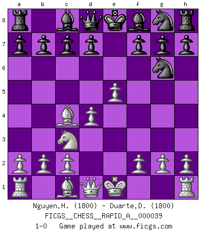 Last move : 1-0 2008 March 22 22:21:18 [Event "FICGS__CHESS__RAPID_A__000039"] [Site "FICGS"] [Date "2008.02.07"] [Round "1"] [White "Nguyen,Hao Nhien"] [Black "Duarte,Duarte Nuno"] [Result "1-0"] [WhiteElo "1800"] [BlackElo "1800"] 1.e4 e5 2.Nf3 Nf6 3.Nc3 Nc6 4.Nxe5 Nxe5 5.d4 Ng6 6.e5 Ng8 7.Bc4 1-0 Petrov Three knights game Player White won this chess game. Follow this game move after move (download)It is difficult to play against Einstein's theory --on his first loss to Fischer. (Mikhail Tal) Wenn man heute mit 14 Jahren noch kein GM ist, kann man es vergessen. (Viswanathan Anand) Por esta medida (el intervalo entre Fischer y sus contemporaneos), yo le considero el mas grande campeón mundial. (Garry Kasparov) Les sacrifices démontrent seulement que quelqu'un a gaffé. (Savielly Tartacover) Life is pleasant. Death is peaceful. It's the transition that's troublesome. (Isaac Asimov)