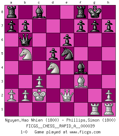 Last move : 1-0 2008 May 6 21:18:5 [Event "FICGS__CHESS__RAPID_A__000039"] [Site "FICGS"] [Date "2008.02.07"] [Round "1"] [White "Nguyen,Hao Nhien"] [Black "Phillips,Simon"] [Result "1-0"] [WhiteElo "1800"] [BlackElo "1800"] 1.e4 c5 2.f4 Nc6 3.Nf3 e6 4.Be2 d5 5.e5 Nh6 6.d4 cxd4 7.Nxd4 Bc5 8.c3 Qb6 9.Nb3 Bg1 10.Qd3 Qf2+ 11.Kd1 Qxg2 12.Bf3 Qf2 13.Na3 Nf5 14.Nb5 O-O 15.Bd2 Qb6 16.Kc2 Ne3+ 17.Bxe3 Bxe3 18.N3d4 Bxf4 19.Rag1 Nxe5 20.Qe2 1-0 This chess game has been lost on time (started : 2008.02.07 4:57:7) Sicilian : Grand Prix attack Kingside Castling by player Black (move 14) Player White won this chess game. Follow this game move after move (download)Winning isn't everything... but losing is nothing. (Mednis) Besser ein falscher Plan, logisch durchgeführt, als gar kein Plan. (Viktor Kortschnoi) El arma más poderosa en el Ajedrez, es tener la próxima movida. (David Bronstein) Mais l'homme est une créature légère et illogique : semblable au joueur d'échecs, il n'aime que le processus du but à atteindre, non le but lui-même. (Dostoïevsky) Hold em is to stud what chess is to checkers. (Johnny Moss)