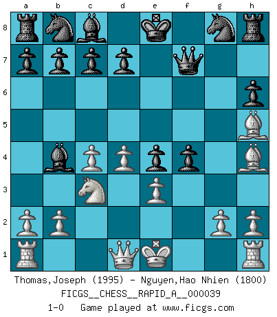 Last move : 1-0 2008 March 12 8:46:33 [Event "FICGS__CHESS__RAPID_A__000039"] [Site "FICGS"] [Date "2008.02.07"] [Round "1"] [White "Thomas,Joseph"] [Black "Nguyen,Hao Nhien"] [Result "1-0"] [WhiteElo "1995"] [BlackElo "1800"] 1.c4 e5 2.Nc3 f5 3.d4 e4 4.f3 Bb4 5.Nh3 Qe7 6.fxe4 fxe4 7.Bg5 Qe6 8.e3 h6 9.Nf4 Qf7 10.Bh4 g5 11.Be2 gxf4 12.Bh5 1-0 English Opening Player White won this chess game. Follow this game move after move (download)Robert Fischer is a law unto himself. (Larry Evans) Glücklicherweise sind Großmeister Ruben Fines reine Schachbücher weniger phallozentrisch [als seine Schachpsychologie] und deswegen auch weniger lächerlich. (Nigel Short) Una mala movida nulifica cuarenta buenas. (Horowitz) La victoire dans une partie d'Echecs appartient la plupart du temps à celui qui voit un peu plus loin que l'adversaire. (Lasker) Now be brave and don't look back. Don't look back. (Shmi Skywalker in Star Wars ep.1)