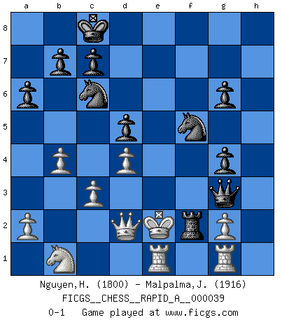 Last move : 0-1 2008 March 30 5:53:32 [Event "FICGS__CHESS__RAPID_A__000039"] [Site "FICGS"] [Date "2008.02.07"] [Round "1"] [White "Nguyen,Hao Nhien"] [Black "Malpalma,Joaquim"] [Result "0-1"] [WhiteElo "1800"] [BlackElo "1916"] 1.e4 e6 2.d4 d5 3.exd5 exd5 4.Bd3 Nc6 5.Nf3 Bd6 6.O-O Nge7 7.c3 Bg4 8.h3 Bh5 9.Bg5 f6 10.Bh4 g5 11.Bg3 Bxg3 12.fxg3 Qd6 13.g4 Bg6 14.Na3 O-O-O 15.Bxg6 hxg6 16.Qa4 a6 17.b4 f5 18.Nxg5 fxg4 19.Nf7 Qg3 20.Nxh8 Rxh8 21.Qc2 Nf5 22.Qd2 Rxh3 23.Rae1 Qh2+ 24.Kf2 Rg3 25.Rg1 Rf3+ 26.Ke2 Qg3 27.Nb1 Rf2+ 0-1 French : Exchange variation Kingside Castling by player White (move 6) Queenside Castling by player Black (move 14) Player Black won this chess game. Follow this game move after move (download)Chess is a part of culture and if a culture is declining then Chess too will decline. (Mikhail Botvinnik) Ich habe Putins Aufstieg an die Macht beobachtet und seine Politik, die demokratischen Institutionen meines Landes zu zerstören. (Garry Kasparov) Los finales de Peón son del Ajedrez lo que el cesped es del Golf. (Cecil Purdy) Je menace de comprendre la position. (Anonyme) Faith : not wanting to know what is true. (Friedrich Nietzsche)
