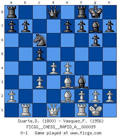 Last move : 0-1 2008 March 21 16:48:40 [Event "FICGS__CHESS__RAPID_A__000039"] [Site "FICGS"] [Date "2008.02.07"] [Round "1"] [White "Duarte,Duarte Nuno"] [Black "Vasquez,Fernando"] [Result "0-1"] [WhiteElo "1800"] [BlackElo "1956"] 1.Nf3 Nf6 2.c4 g6 3.d4 Bg7 4.Nc3 d5 5.cxd5 Nxd5 6.e4 Nxc3 7.bxc3 c5 8.Rb1 O-O 9.Be2 Nc6 10.Be3 Bg4 11.O-O Bxf3 0-1 This chess game has been lost on time (started : 2008.02.07 4:57:7) Reti Opening Kingside Castling by player Black (move 8) Kingside Castling by player White (move 11) Player Black won this chess game. Follow this game move after move (download)Chess teaches you to control the initial excitement you feel when you see something that looks good and it trains you to think objectively when you're in trouble. (Stanley Kubrick) Ich habe die Schachforschung dermaßen betrieben, dass sie auf eine wissenschaftliche Basis gestellt wurde. (Mikhail Moiseyevich Botvinik) Solo el jugador con la iniciativa tiene el derecho a atacar. (Wilhelm Steinitz) L'action d'une oeuvre littéraire se déroule sur un champ de bataille. Les masques et les types du drame moderne correspondent aux pièces du jeu d'échecs. L'intrigue correspond aux coups et aux gambits, c'est à dire aux techniques du jeu telles qu'utilisées et interprétées par les joueurs. Les tactiques et les péripéties [mouvements] correspondent aux coups exécutés par l'adversaire. (Viktor Shklovsky) Macintosh - we might not get everything right, but at least we knew the century was going to end. (Douglas Adams)