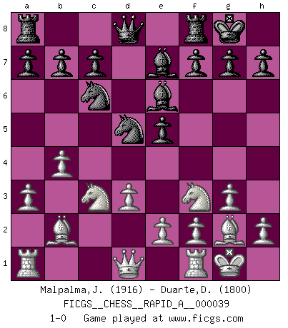 Last move : 1-0 2008 March 20 16:47:45 [Event "FICGS__CHESS__RAPID_A__000039"] [Site "FICGS"] [Date "2008.02.07"] [Round "1"] [White "Malpalma,Joaquim"] [Black "Duarte,Duarte Nuno"] [Result "1-0"] [WhiteElo "1916"] [BlackElo "1800"] 1.c4 e5 2.Nc3 Nf6 3.Nf3 Nc6 4.g3 d5 5.cxd5 Nxd5 6.Bg2 Nb6 7.O-O Be7 8.d3 O-O 9.a3 Be6 10.b4 Nd5 11.Bb2 1-0 This chess game has been lost on time (started : 2008.02.07 4:57:7) English Opening Kingside Castling by player White (move 7) Kingside Castling by player Black (move 8) Player White won this chess game. Follow this game move after move (download)You cannot play at Chess if you are kind-hearted. (French Proverb) Heutzutage gewinnt im Turnier nicht derjenige Spieler, der weitreichende Pläne entwirft, sondern einfach jener, der Zug um Zug kämpft. (David Bronstein) El Ajedrez es imaginación. (David Bronstein) Echiquier : carré parfait, comme la Jérusalem nouvelle décrite par l'auteur de l'Apocalypse, huit cases sur huit, exaltation du chiffre 4, symbole du cosmos aux quatre horizons... où le noir et le blanc, l'ombre et la lumière, le mal et le bien s'entremêlent et se conjuguent. (Robert Couffignal, Le Gambit du poète) A clear conscience is usually the sign of a bad memory. (Unknown)