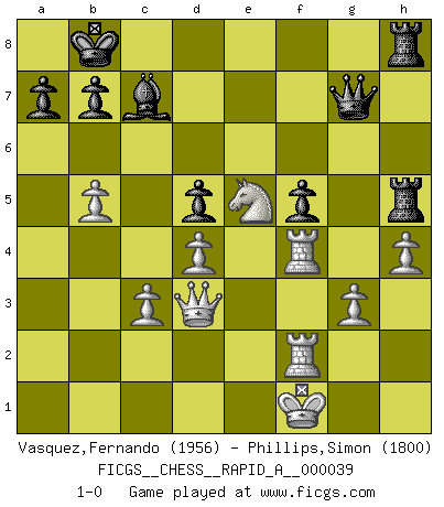 Last move : 1-0 2008 April 29 8:55:33 [Event "FICGS__CHESS__RAPID_A__000039"] [Site "FICGS"] [Date "2008.02.07"] [Round "1"] [White "Vasquez,Fernando"] [Black "Phillips,Simon"] [Result "1-0"] [WhiteElo "1956"] [BlackElo "1800"] 1.e4 c6 2.d4 d5 3.e5 Bf5 4.Nf3 e6 5.Be2 Nd7 6.O-O Ne7 7.Nh4 Bg6 8.Nd2 Nf5 9.Nxg6 hxg6 10.Nf3 Qc7 11.Bf4 Be7 12.Qd2 O-O-O 13.c3 g5 14.Bxg5 f6 15.Bf4 fxe5 16.Bxe5 Nxe5 17.Nxe5 Bd6 18.f4 g5 19.Bd3 gxf4 20.Rxf4 Qh7 21.g3 Rdg8 22.Bxf5 exf5 23.Re1 Rg7 24.a4 Bc7 25.Re2 Qh3 26.Qd3 Rg5 27.b4 Qh7 28.b5 cxb5 29.axb5 Rh5 30.h4 Kb8 31.Ref2 Qg7 32.Kf1 1-0 This chess game has been lost on time (started : 2008.02.07 4:57:7) Caro-Kann : Advance variation Kingside Castling by player White (move 6) Queenside Castling by player Black (move 12) Player White won this chess game. Follow this game move after move (download)We must make sure that Chess will not be like a dead language, very interesting, but for a very small group. (Sytze Faber) Im Wettkampf zwischen starken Meistern kommen Fehler sehr selten vor, deshalb ist es mit bloßem Warten nicht getan. (José Raúl Capablanca) No es suficiente ser un buen jugador, se debe también de jugar bién. (Siegbert Tarrasch) Les écrivains ont utilisé les échecs pour analyser les côtés extrêmes de la nature humaine. Dans ce cadre, les échecs offrent un champ d'expérimentation idéal. Mais on pourrait faire la même chose avec la peinture. Et là, en vous référant à Van Gogh, vous ne tirerez pas de conclusion définitive sur les peintres. (Gary Kasparov) I believe in luck. How else can you explain the success of those you dislike ? (Jean Cocteau)