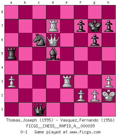 Last move : 0-1 2008 May 21 10:22:50 [Event "FICGS__CHESS__RAPID_A__000039"] [Site "FICGS"] [Date "2008.02.07"] [Round "1"] [White "Thomas,Joseph"] [Black "Vasquez,Fernando"] [Result "0-1"] [WhiteElo "1995"] [BlackElo "1956"] 1.e4 e5 2.Nf3 Nf6 3.Nxe5 d6 4.Nf3 Nxe4 5.d4 d5 6.Bd3 Be7 7.O-O Nc6 8.c4 Nb4 9.Be2 O-O 10.Nc3 Re8 11.Qb3 a5 12.a3 Nxc3 13.bxc3 a4 14.Qb1 Nc6 15.Bd3 g6 16.cxd5 Qxd5 17.Re1 Na5 18.Bf4 Bg4 19.Ne5 Be6 20.Bb5 Rec8 21.Bxa4 c5 22.dxc5 Bf6 23.Qb4 Qxc5 24.Bc2 Qxc3 25.Be4 Bxe5 26.Bxe5 Qxe5 27.Bxb7 Qf5 28.Be4 Qf6 29.Bxa8 Rxa8 30.h3 Kg7 31.Rac1 Nb3 32.Rc6 Qd4 33.Qe7 Bd5 34.Rc7 Na5 35.Rd7 Nc6 36.Qd6 Qc3 37.Re3 Qc1+ 38.Kh2 Ra5 0-1 This chess game has been lost on time (started : 2008.02.07 4:57:7) Petrov : Classical attack Kingside Castling by player White (move 7) Kingside Castling by player Black (move 9) Player Black won this chess game. Follow this game move after move (download)Bobby Fischer's current state of mind is indeed a tragedy. One of the world's greatest Chess players - the pride and sorrow of American Chess. (Frank Brady) Ein unbeabsichtigtes Patt ist der Gipfel der Dummheit. (Anonymous) Un buen jugador siempre tiene buena suerte. (José Raúl Capablanca) Nous vivons dans un monde échiquéen : chaque jour qui passe est un défi à relever. (Philosophe Sasha) Don't be discouraged. It's often the last key in the bunch that opens the lock. (Author unknown)