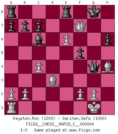 Last move : 1-0 2006 July 14 16:4:40 [Event "FICGS__CHESS__RAPID_C__000004"] [Site "FICGS"] [Date "2006.07.02"] [Round "1"] [White "Keyston,Ron"] [Black "Sarihan,Sefa"] [Result "1-0"] [WhiteElo "1200"] [BlackElo "1000"] 1.e4 e6 2.d4 d5 3.Nc3 dxe4 4.Nxe4 Nf6 5.Bd3 Be7 6.Nf3 Bd7 7.Nxf6+ Bxf6 8.O-O Bc6 9.c3 Nd7 10.Re1 O-O 11.Bf4 g5 12.Ne5 Bxe5 13.Bxe5 f6 14.Bg3 Re8 15.h4 h6 16.Qh5 Qe7 17.c4 gxh4 18.Bxh4 Qg7 19.d5 Ne5 20.Re3 Ng4 21.Rg3 f5 22.dxe6 Qd4 23.Rxg4+ Qxg4 24.Qf7+ 1-0 French : Rubinstein variation Kingside Castling by player White (move 8) Kingside Castling by player Black (move 10) Player White won this chess game. Follow this game move after move (download)Later, I began to succeed in decisive games. Perhaps because I realized a very simple truth: not only was I worried, but also my opponent. (Mikhail Tal) Stil? Ich habe keinen Stil! (Anatoly Karpov) La mitad de las variaciones que son calculadas en una partida de torneo, resultan ser completamente superfluas. Desafortunadamente, nadie sabe por adelantado cual mitad. (Jan Tinman) Un millionnaire : 'Monsieur Steinitz ! Vous ne participez aux tournois que pour l'argent, alors que moi je n'y viens que pour l'honneur.' Steinitz : 'Chacun joue pour ce qu'il n'a pas'... There are two kinds of people in the world, my friend. Those who have a loaded gun and those who dig. You dig ! (Blondie in The Good, The Bad and The Ugly)