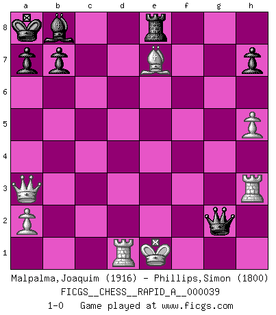 Last move : 1-0 2008 June 5 11:39:43 [Event "FICGS__CHESS__RAPID_A__000039"] [Site "FICGS"] [Date "2008.02.07"] [Round "1"] [White "Malpalma,Joaquim"] [Black "Phillips,Simon"] [Result "1-0"] [WhiteElo "1916"] [BlackElo "1800"] 1.e4 c6 2.d4 d5 3.Nc3 dxe4 4.Nxe4 Nd7 5.Nf3 Ngf6 6.Nxf6+ Nxf6 7.Ne5 Bf5 8.c3 e6 9.g4 Bg6 10.h4 Qc7 11.Rh3 O-O-O 12.h5 Be4 13.f3 Bd5 14.g5 c5 15.gxf6 cxd4 16.cxd4 gxf6 17.Nd3 Kb8 18.Bf4 Bd6 19.Qd2 e5 20.dxe5 Rhe8 21.Rc1 Qe7 22.Be3 fxe5 23.Nc5 Bc6 24.Qc2 e4 25.fxe4 Ka8 26.b4 Rc8 27.Qd3 f5 28.exf5 Rcd8 29.Qc3 Qf8 30.Qa3 Qxf5 31.Ne4 Bb8 32.Nf2 Qf6 33.Be2 Rg8 34.Ng4 Qe6 35.b5 Bxb5 36.Bxb5 Qxg4 37.Bc5 Qg2 38.Rd1 Rge8+ 39.Bxe8 Rxe8+ 40.Be7 1-0 This chess game has been lost on time (started : 2008.02.07 4:57:7) Caro-Kann : Steinitz variation Queenside Castling by player Black (move 11) Player White won this chess game. Follow this game move after move (download)It is no time to be playing Chess when the house is on fire. (Italian Proverb) Ein Teil des Fehlers ist immer korrekt. (Savielly Grigorievitsch Tartakower) Yo no creo en la psicología. Yo creo en las buenas movidas. (Bobby Fischer) Seul un grand joueur sait à quel point il joue faiblement. (Xavier Tartacover) Two beer, or not two beer. (Unknown)