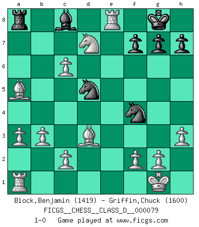 Last move : 1-0 2008 March 8 12:27:23 [Event "FICGS__CHESS__CLASS_D__000079"] [Site "FICGS"] [Date "2008.02.07"] [Round "1"] [White "Block,Benjamin"] [Black "Griffin,Chuck"] [Result "1-0"] [WhiteElo "1419"] [BlackElo "1600"] 1.e4 d5 2.exd5 e6 3.Bb5+ c6 4.dxc6 bxc6 5.Be2 Nf6 6.Nf3 Nbd7 7.O-O Bd6 8.d4 O-O 9.Nbd2 c5 10.Nc4 Nb6 11.Nxd6 Qxd6 12.Be3 Bb7 13.dxc5 Qxd1 14.Rfxd1 Nbd5 15.Bd3 Ng4 16.Bd2 e5 17.h3 Ngf6 18.Nxe5 Rfe8 19.c6 Bc8 20.Re1 a5 21.a3 Rb8 22.b3 Nh5 23.Bxa5 Nhf4 24.Nd7 Ra8 25.Rxe8+ 1-0 Scandinavian (centre counter) defense Kingside Castling by player White (move 7) Kingside Castling by player Black (move 8) Player White won this chess game. Follow this game move after move (download)When your house is on fire, you can't be bothered with the neighbors. Or, as we say in Chess, if your King is under attack you don't worry about losing a Pawn on the Queen's side. (Gary Kasparov) Kritik überlasse ich den Spießern. Ich zeige nichts, wofür ich mich schämen muss. (Alexandra Kosteniuk) El Ajedrez expande y enriquece tu mente. (Saudin Robovic) Pour moi, les échecs ne sont pas un jeu mais un art. (Alexandre Alekhine) Without enthusiasm, virtue functions not at all, and vice only poorly. (Mignon McLaughlin, The Neurotic's Notebook, 1960)