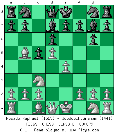Last move : 0-1 2008 April 12 19:33:6 [Event "FICGS__CHESS__CLASS_D__000079"] [Site "FICGS"] [Date "2008.02.07"] [Round "1"] [White "Rosado,Raphael"] [Black "Woodcock,Graham"] [Result "0-1"] [WhiteElo "1629"] [BlackElo "1441"] 1.d4 c5 2.d5 d6 3.Nc3 g6 4.e4 Bg7 5.Bb5+ Bd7 0-1 This chess game has been lost on time (started : 2008.02.07 10:14:55) Old Benoni : Schmid's system Player Black won this chess game. Follow this game move after move (download)Chess makes man wiser and clear-sighted. (Vladimir Putin) Es ist peinlich, dass ich nie Weltmeister wurde. Es wäre leicht, Leonid Breschnjew als Ursache vorzuschieben, dessen Apparat den Vorzeigekommunisten Anatoli Karpow in allem unterstützte. Aber Garri Kasparow zum Beispiel, der ebenfalls von den Sowjets unerwünscht war, hat trotz der Widerstände den WM-Titel erobert. (Viktor Kortschnoi) El Ajedrez es imaginación. (David Bronstein) Karpov est une pièce de musée. (Garry Kasparov) Luck has a peculiar habit of favoring those who don't depend on it. (Author unknown)