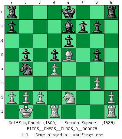 Last move : 1-0 2008 June 4 23:38:54 [Event "FICGS__CHESS__CLASS_D__000079"] [Site "FICGS"] [Date "2008.02.07"] [Round "1"] [White "Griffin,Chuck"] [Black "Rosado,Raphael"] [Result "1-0"] [WhiteElo "1600"] [BlackElo "1629"] 1.e4 c6 2.d4 d5 3.Nc3 dxe4 4.Bc4 Nf6 5.f3 exf3 6.Nxf3 Bf5 7.Be3 e6 8.Ne5 Bg6 9.Nxg6 hxg6 10.Bg5 Be7 11.Ne2 Nbd7 12.Qd3 Nd5 13.Bf4 N7f6 14.O-O-O b5 15.Bxd5 Nxd5 16.g3 Nb4 17.Qb3 Qd5 18.Qxd5 cxd5 19.Kb1 g5 20.Be5 1-0 This chess game has been lost on time (started : 2008.02.07 10:14:55) Caro-Kann defense Queenside Castling by player White (move 14) Player White won this chess game. Follow this game move after move (download)Morphy was probably the greatest genius of them all. (Bobby Fischer) Mit sehr nachdenklichem Gesicht schreitet Bobby durch den Turniersaal. Was ist passiert?, fragt Lombardy. Ich stehe schlecht, antwortet Fischer. Lombardy: Dann biete doch einfach Remis an. Fischer: So schlecht stehe ich nun auch wieder nicht! (Robert James Fischer) La táctica fluye a partir de una posición superior. (Bobby Fischer) Je menace de comprendre la position. (Anonyme) Only sick music makes money today. (Friedrich Nietzsche)