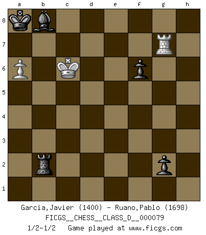 Last move : 1/2-1/2 2008 July 14 21:9:25 [Event "FICGS__CHESS__CLASS_D__000079"] [Site "FICGS"] [Date "2008.02.07"] [Round "1"] [White "Garcia,Javier"] [Black "Ruano,Pablo"] [Result "1/2-1/2"] [WhiteElo "1400"] [BlackElo "1698"] 1.d4 d5 2.Nf3 Nc6 3.Bf4 Nf6 4.e3 Nh5 5.g3 Nxf4 6.gxf4 Qd6 7.a3 Bg4 8.c4 Nxd4 9.exd4 Qe6+ 10.Kd2 Qe4 11.Be2 Bxf3 12.Bxf3 Qxd4+ 13.Kc1 Qxc4+ 14.Nc3 Qxf4+ 15.Kb1 c6 16.Bxd5 cxd5 17.Nxd5 Qe4+ 18.Ka2 Rc8 19.Qb3 Qc4 20.Rac1 Qxb3+ 21.Kxb3 Rxc1 22.Rxc1 e6 23.Ne3 Kd7 24.Rd1+ Kc7 25.Rc1+ Kb8 26.Nc4 Be7 27.Ne5 f6 28.Nd7+ Ka8 29.Ka4 Rd8 30.Kb5 a6+ 31.Kb6 Bd6 32.Nc5 Bf4 33.Nxb7 Rb8 34.Rc6 Rxb7+ 35.Kxa6 Rxb2 36.Rxe6 Rxf2 37.Re7 g5 38.Rxh7 Bxh2 39.a4 g4 40.a5 Bb8 41.Kb6 g3 42.a6 g2 43.Rg7 Rb2+ 44.Kc6 Ba7 45.Rg8+ Bb8 46.Rg7 Ba7 47.Rg8+ Bb8 48.Rg7 1/2-1/2 Queen's pawn game, Chigorin variation 10 pieces endgame at move 36 : White KRPP , Black KRBPPP WHITE : King + 1 Rook 2 Pawns BLACK : King + 1 Rook 1 Bishop 3 Pawns 9 pieces endgame at move 38 : White KRPP , Black KRBPP WHITE : King + 1 Rook 2 Pawns BLACK : King + 1 Rook 1 Bishop 2 Pawns 8 pieces endgame at move 38 : White KRP , Black KRBPP WHITE : King + 1 Rook 1 Pawn BLACK : King + 1 Rook 1 Bishop 2 Pawns This chess game ended in a draw. Follow this game move after move (download)Mistrust is the most necessary characteristic of the Chess player. (Siegbert Tarrasch) Modernes Schach sorgt sich zuviel um Dinge wie Bauernstruktur usw. Vergessen Sie das, Schachmatt beendet das Spiel! (Nigel Short) Los errores estan ahí, esperando a que se cometan. (Savielly Tartakower) Le jeu d'échecs est comme rejeté hors du temps. (Antoine de Saint-Exupéry) A mistake is only a mistake if you let it happen twice. Otherwise it is a learning experience. (Daniel Parmet)