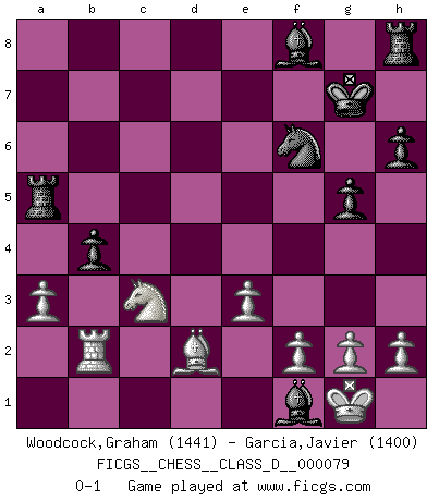 Last move : 0-1 2008 July 14 3:41:8 [Event "FICGS__CHESS__CLASS_D__000079"] [Site "FICGS"] [Date "2008.02.07"] [Round "1"] [White "Woodcock,Graham"] [Black "Garcia,Javier"] [Result "0-1"] [WhiteElo "1441"] [BlackElo "1400"] 1.d4 d5 2.c4 c6 3.e3 Nf6 4.cxd5 Qxd5 5.Nc3 Qa5 6.Bd2 e5 7.dxe5 Qxe5 8.a3 g5 9.Nf3 Qe7 10.Bc4 h6 11.Qb3 Nbd7 12.O-O Nc5 13.Qa2 a5 14.Rad1 b5 15.Bxf7+ Qxf7 16.Qxf7+ Kxf7 17.Ne5+ Kg7 18.Nxc6 Ba6 19.Rfe1 Nd3 20.Rf1 b4 21.Nxa5 Nxb2 22.Rb1 Bxf1 23.Rxb2 Rxa5 0-1 QGD Slav defense Kingside Castling by player White (move 12) Player Black won this chess game. Follow this game move after move (download)For surely of all the drugs in the world, Chess must be the most permanently pleasurable. (Assiac) Ein Schachspiel besteht aus drei Phasen: Die erste, wenn du hofftst den Vorteil zu haben, die zweite, wenn du glaubst einen Vorteil zu haben, und die dritte.... wenn du weißt Du wirst verlieren. (Savielly Grigorievitsch Tartakower) En el Ajedrez, tal como en la vida, las bendiciones de hoy pueden ser el veneno del mañana. (Assaic) Mais n'est-ce pas déjà le limiter injurieusement que d'appeler les échecs un jeu? N'est-ce pas aussi une science, un art, ou quelque chose qui, comme le cercueil de Mahomet entre ciel et terre, est suspendu entre l'un et l'autre, et qui réunit un nombre incroyable de contraires ? (Stefan Zweig) I know the human being and fish can coexist peacefully. (George W. Bush, Saginaw sept. 29, 2000)